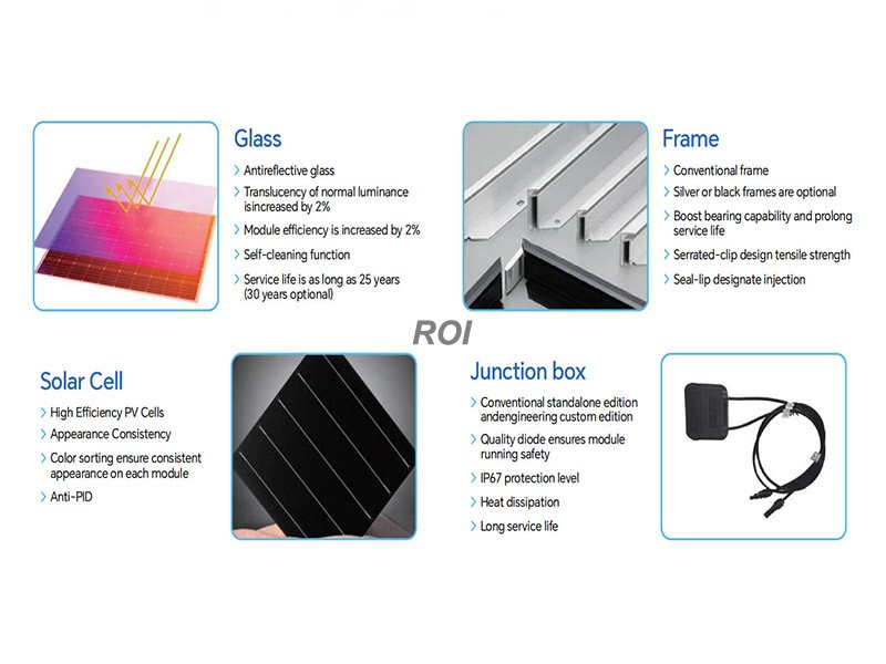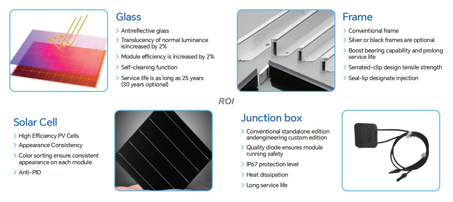 Высокоэффективные фотоэлектрические элементы: единообразие внешнего вида, цветовая сортировка обеспечивает единообразный внешний вид каждого модуля.